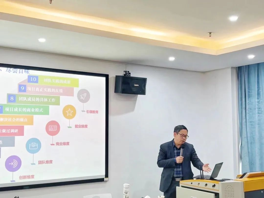 会议伊始,殷章馨以“跨界,成长,话赛事”为主题,简单介绍了老员工创新创业三大权威赛事及省级和国家层面的相关高校创业赛事。紧接着尹青军老师从创新创业内源精神、“互联网+”赛道组成、赛道规则,商业模式等几个方面进行了深度剖析,重点强调了赛事期间该如何进行准备,并从员工定位、导师定位、项目人员组成、项目完整度给出了合理化的建议。