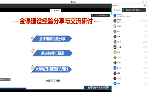2023年3月28日晚上7点,为落实公司以及公司“两性一度”金课建设,球速体育物理系开展了以“金课建设经验分享与交流研讨”为主题的线上会议,会议由物理系主任吴昌义主持,物理系全体教师参加了会议。会议内容包括三大部分内容:第一,金课建设经验分享;第二,新进教师汇报课;第三,大学物理课程建设研讨。