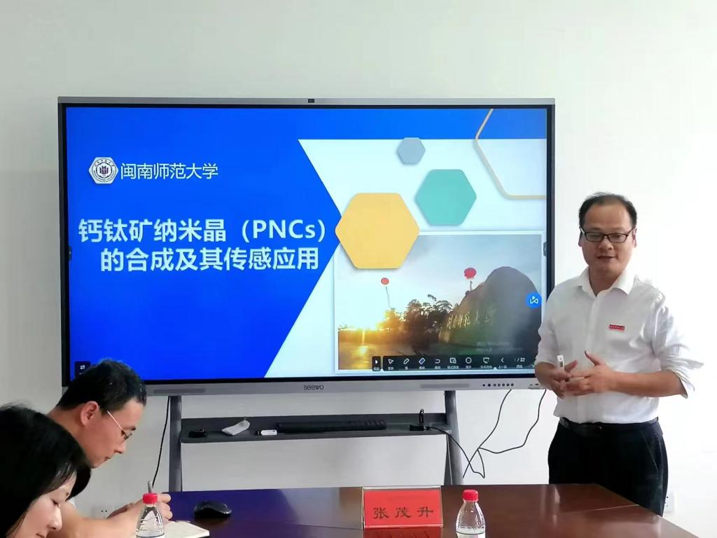 2023年5月26日,闽南师范大学张茂升教授受邀于百熙楼1013室为公司物理系、化学系全体教师作题为“钙钛矿纳米晶(PNCs)的合成及其传感应用”的学术讲座。讲座由球速体育副经理(主持行政工作)许兰教授主持。